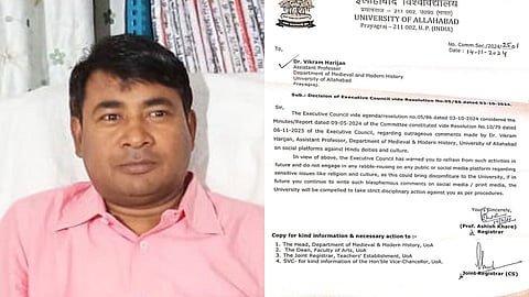 उतर प्रदेश: इलाहाबाद विश्वविद्यालय (इविवि) में मध्यकालीन एवं आधुनिक इतिहास विभाग के असिस्टेंट प्रोफेसर डॉ. विक्रम हरिजन को विश्वविद्यालय की ओर से लिखित चेतावनी प्राप्त हुई है जिसमें देवी-देवताओं के खिलाफ अपमानजनक टिप्पणी करने पर उनके खिलाफ कार्रवाई करने की हिदायत दी गई है.