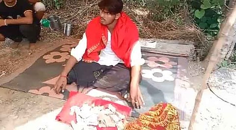 इधर, आसीवन थाना प्रभारी अनुराग सिंह मौके पर पहुंच गए। उन्होंने पुरातत्व विभाग के अफसरों को सूचना देकर मूर्तियों को अशोक के घर पर रखवा दिया और चले गए। दूसरे दिन बुधवार को अशोक के बेटे रवि गौतम, विजय गौतम ने मूर्तियों को उठाकर उसी खेत में खोदे गए गड्ढे के पास लाल रंग के कपड़े पर रख दिया। पिता व दोनों पुत्र झोले में प्रसाद लेकर बैठ गए। लोग चढ़ावा चढ़ाने पहुंचने लगे तो रवि ने सभी को प्रसाद बांटा।